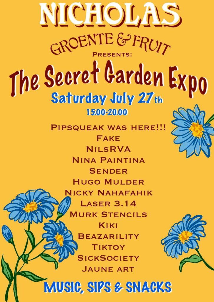 With The Immanent Closure of @thesecretgardenamsterdam We’ve Decided to Celebrate its Beauty on SATURDAY, JULY 27th from 15:00-20:00, with Our FIRST EDITION of The Secret Garden Expo! There Has Been Over Three Hundred Artist Involved Over The Last Three Years, So The First Round Was Not Easy to Pick! But We’ve Narrowed It Down to Fourteen! Each of These First Fourteen Have Added Something Special (As Has Every Artist Involved) and We Want to Give You All A Chance to Take Some of Their Works Home With You! The Legendary Zender will Not Only Show a Piece, BUT ALSO Spin His Magic on the Ones & Twos! And Of Course Lots Of Treats from Yours Truly! So Mark It Down & Come on Around to Celebrate & Maybe Even Take Home A Memory or Two! Hope To See Lots Of You There!